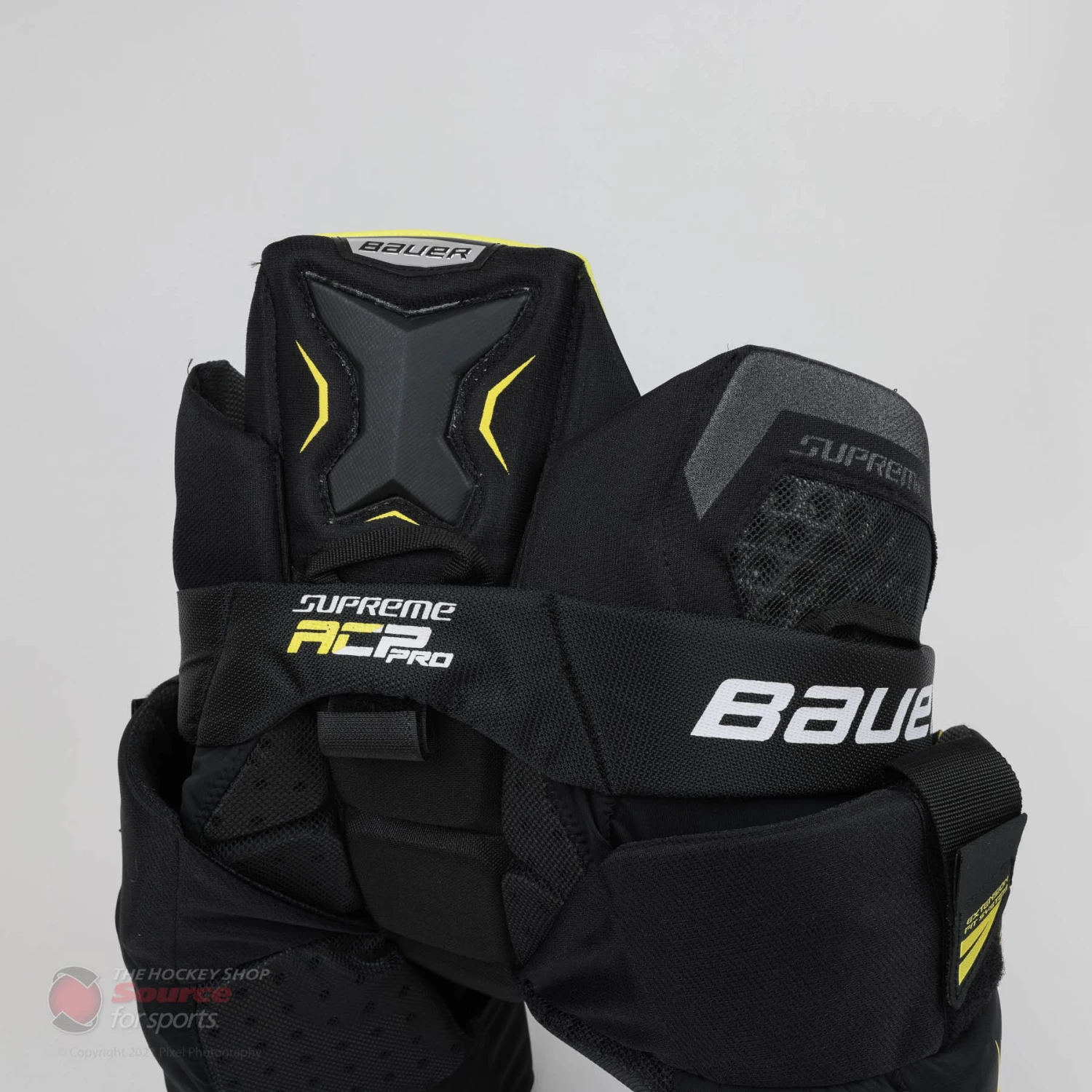The Bauer Supreme ACP Pro girdle uses an independent spine protection piece. This separate section allows the spine protection to move fluidly with your body movements. It is also equipped with additional high-density foam to further protect the spinal region.