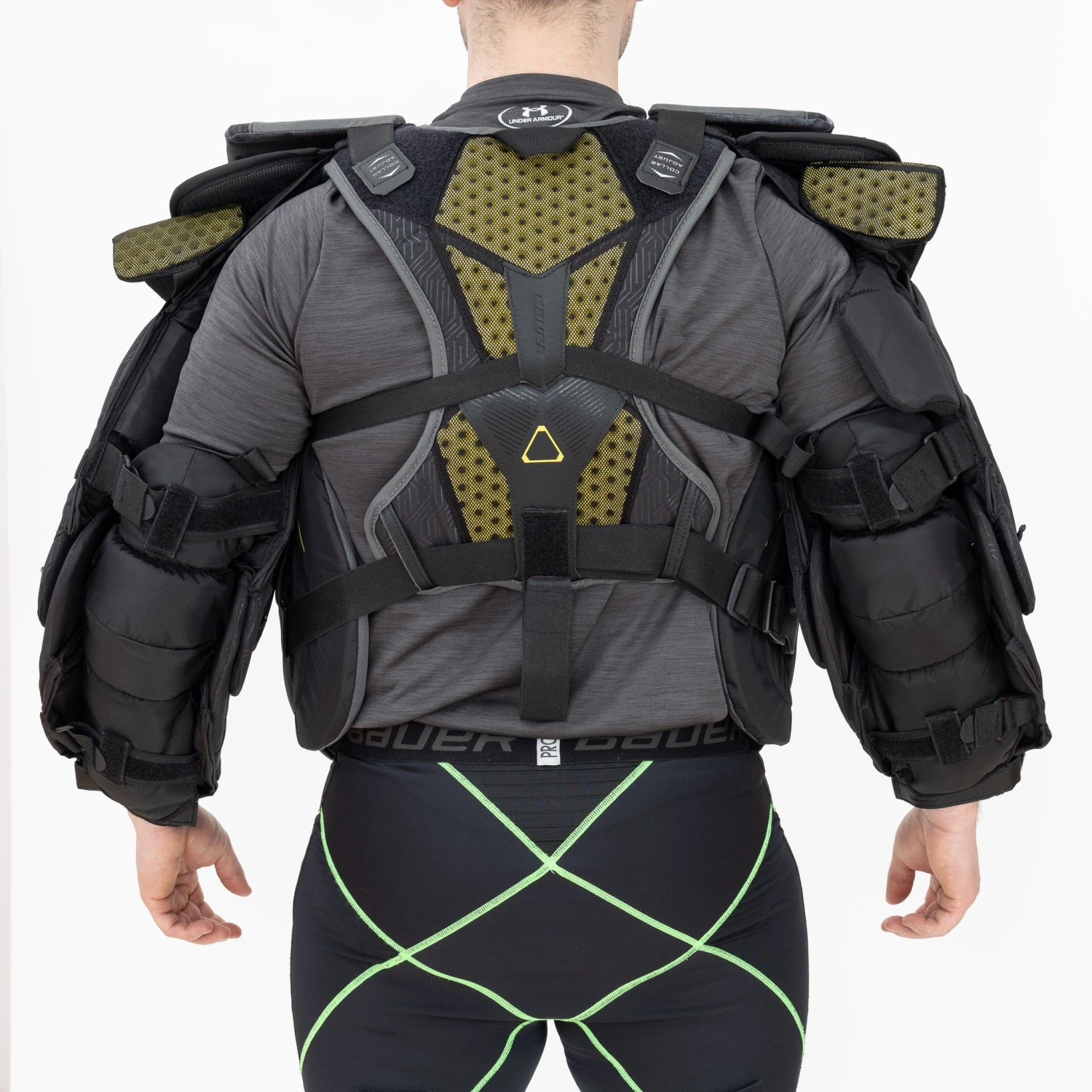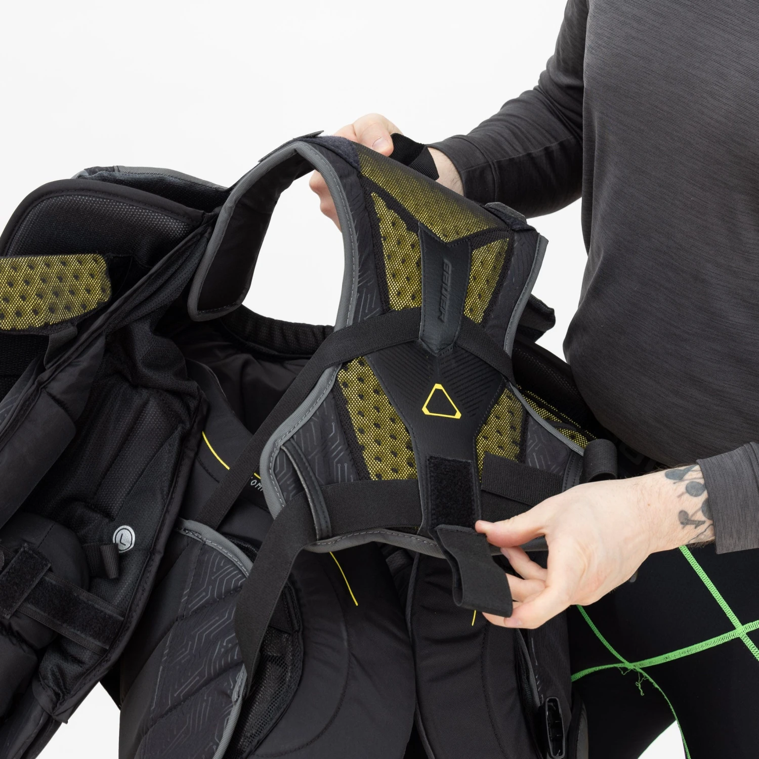 Foams along the inside have been molded to enhance ventilation, particularly in the back with the Molded Airflow Spinal design. For elite protection and performance on rebounds, the arms feature a Fused Comp with CURV forearm and bicep composition. Similarly, Bauer implemented Rebound Control Foam in the sternum for increased coverage and impact absorption.