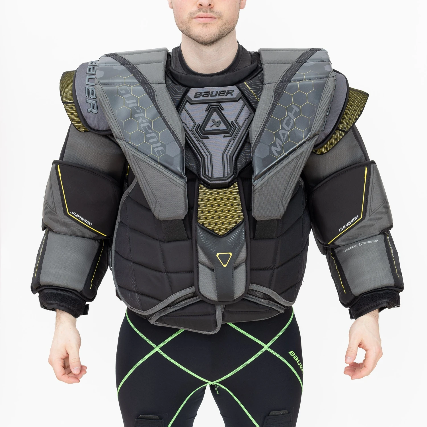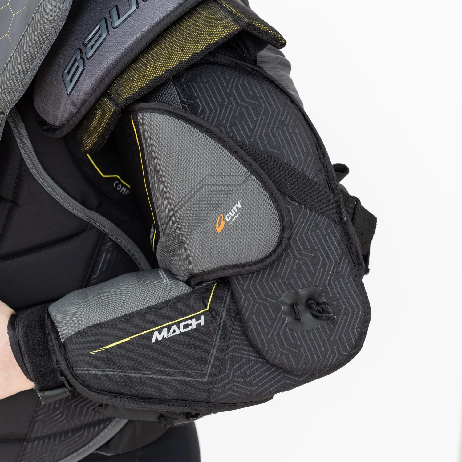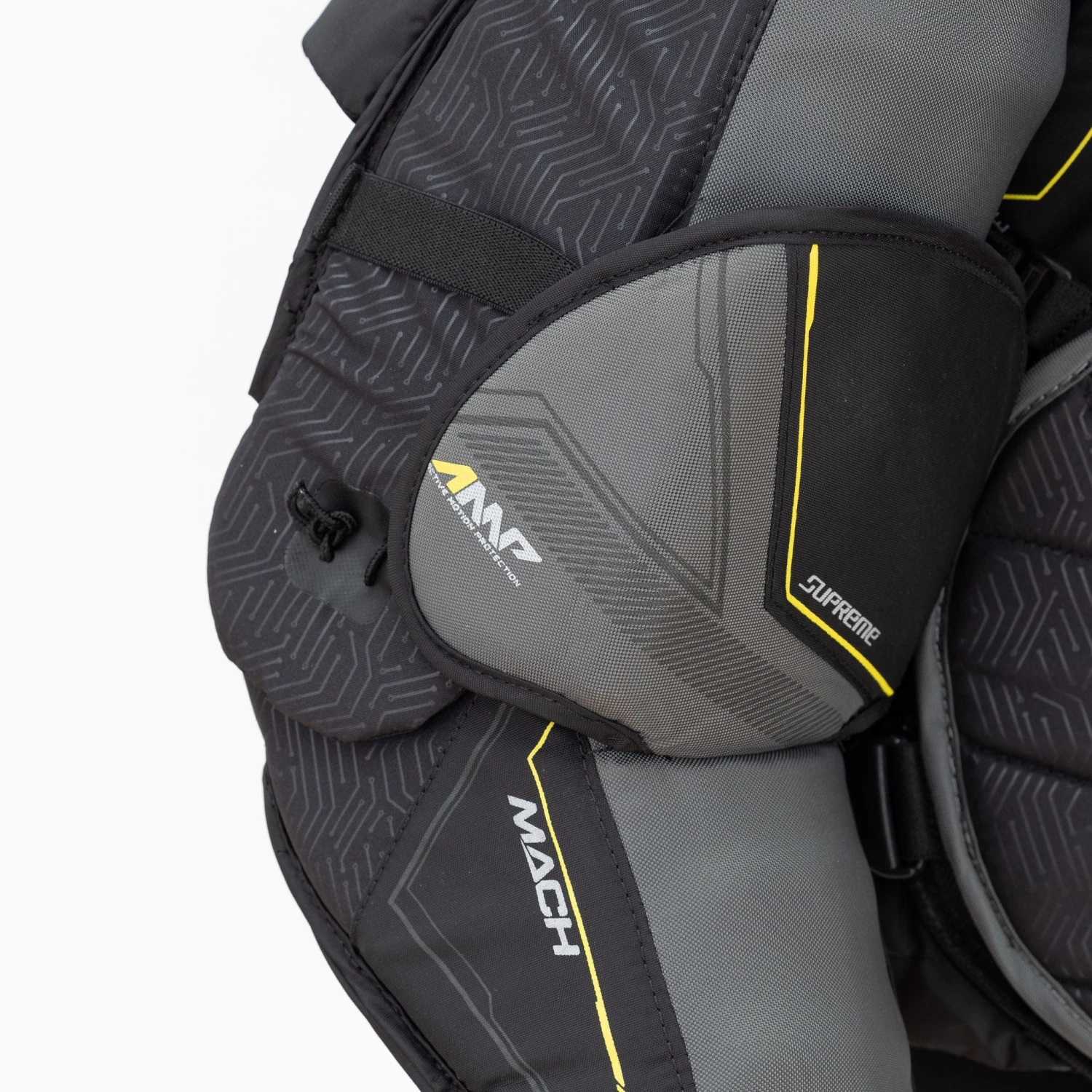 Bauer has greatly upped their game with the release of the brand new Mach goalie gear, the next chapter in the Supreme protective series. Many upgrades were made to the previous Ultrasonic chest and arm protector to get to the Mach, some of which include the use of Shock-Lite and Shock-Lite Pro, Rebound Control Foam, and a new Active Motion Protection (AMP) hinge arm design. The Mach looks to continue that high coverage and protective trend from the Supreme side with these game-changing enhancements.