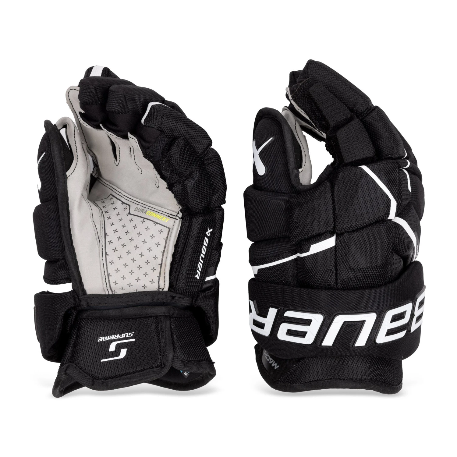 The Bauer Mach hockey gloves feature a light grey DuraCONNEKT palm, offering enhanced feel and comfort on the ice. The palm material is designed to be 30% more durable than its predecessor, the CONNEKT+ palm, ensuring long-lasting performance. The gloves also incorporate comfort stretch gussets, allowing for pro-level flexibility and hand movement.