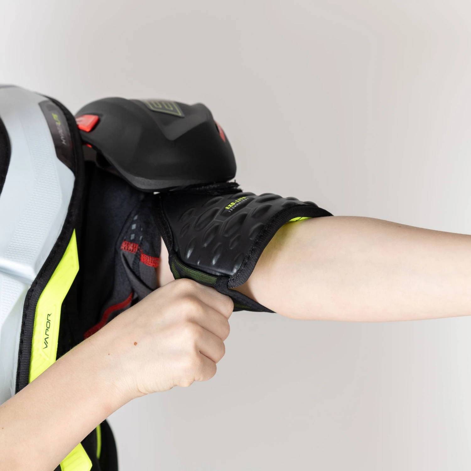The shoulder caps are made of Aerolite 2.0 and connected to the pads with Connektor to hold them in place. Aerolite is found in protectives across Bauer equipment and other sports and is known for its light weight and strong ability to absorb and disperse the impact from big hits.