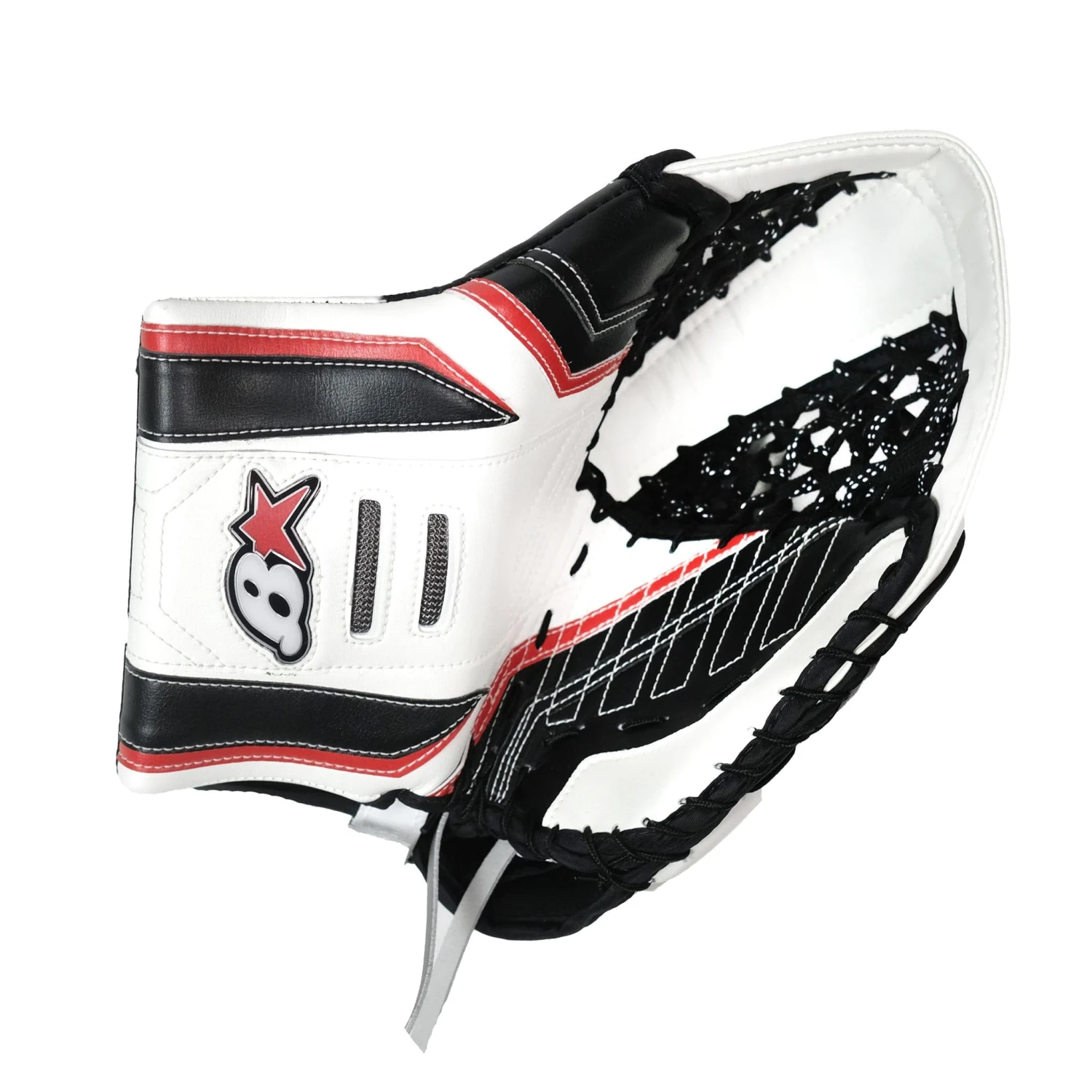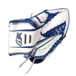 The Optik 3 Senior goalie catcher comes in a Regular hand variation and Black/White, Blue/White/Silver, and White/Red/Black colourways. Additional sizing and colours are available in custom.