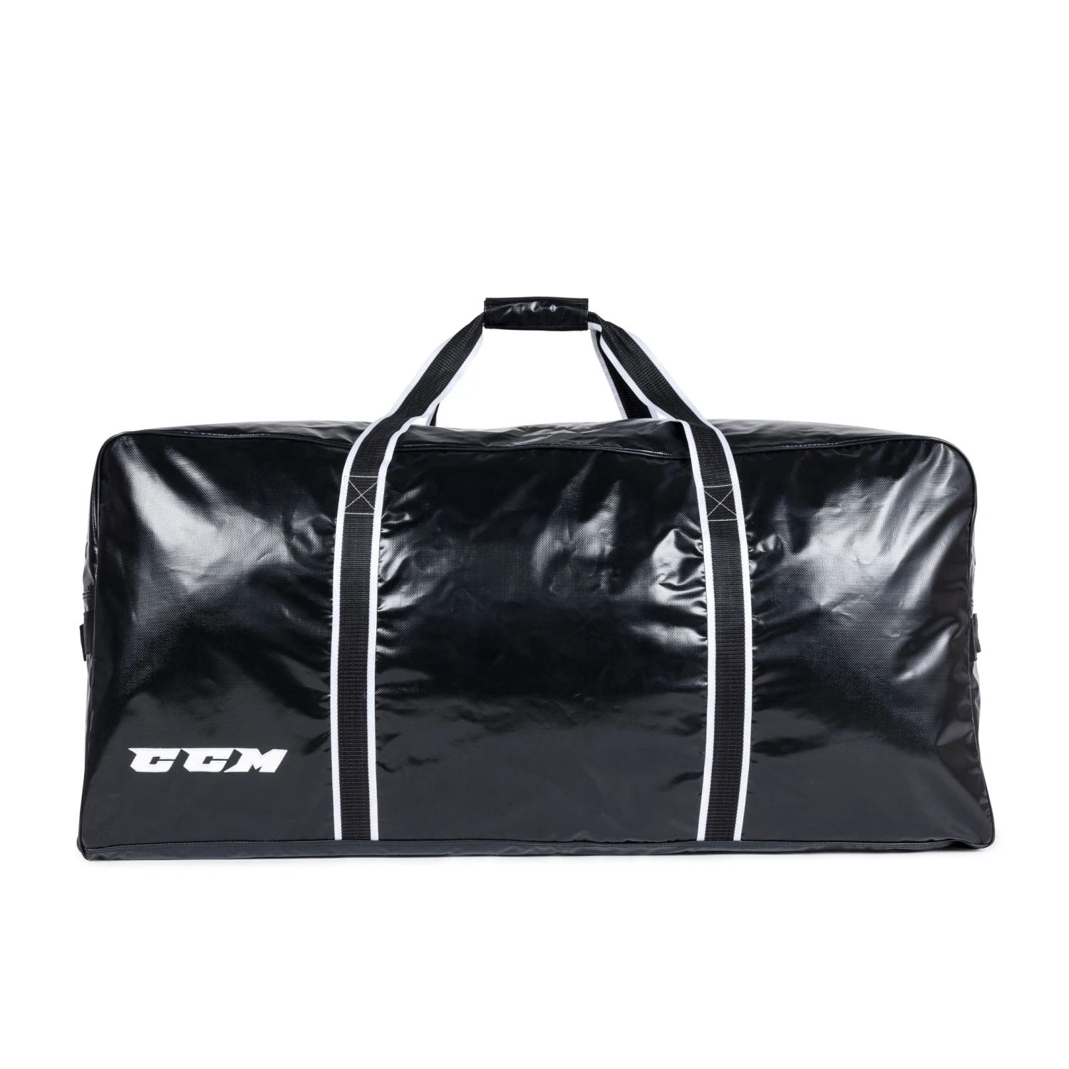 The pro carry goal bag from CCM is made with heavy duty water-resistant tarpaulin to provide long-term durability against wear and tear. The side panels have been left blank with large openings?the perfect place for teams to customize their bags with screened logos. At each end is a reinforced webbed handle in addition to centralized main carry straps. The pro carry goal bag also includes air grommets to allow air flow-through to promote freshness, as well as an internal zippered mesh accessory pocket and player ID pocket.