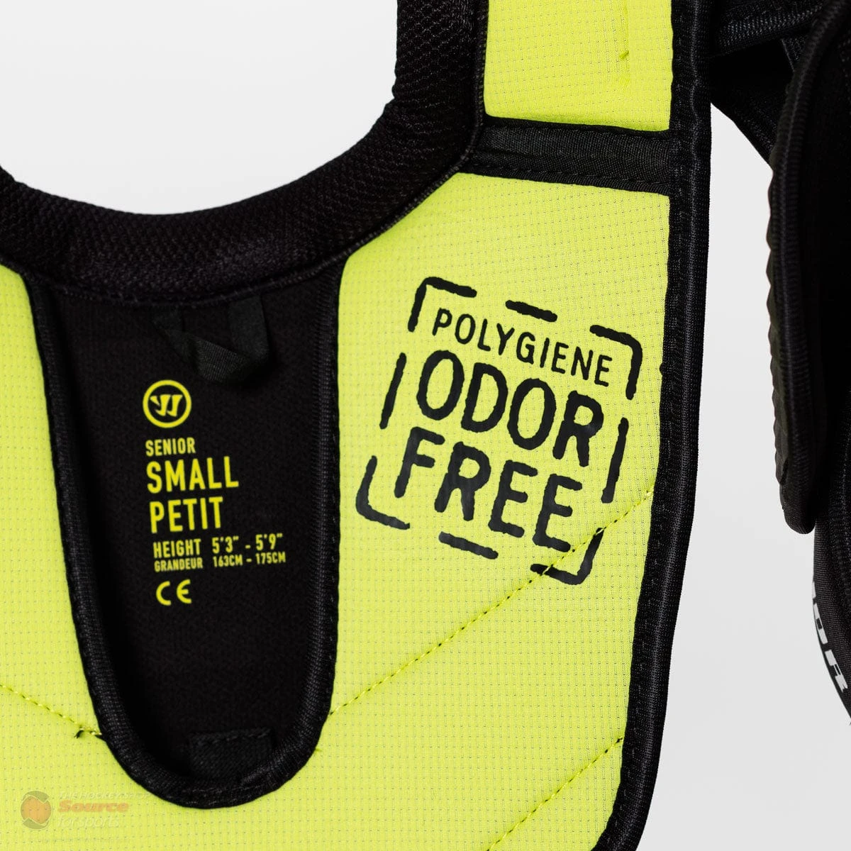 The Alpha DX offers an adjustable two-piece bicep design to provide a better fit for a wider range of players and keep the protection tight against your body. Protection along the biceps is also provided through Warrior’s DX Shell. The DX Shell uses a compression molded EVA foam and also has a Shell Skin Texture to better disperse and absorb impacts.