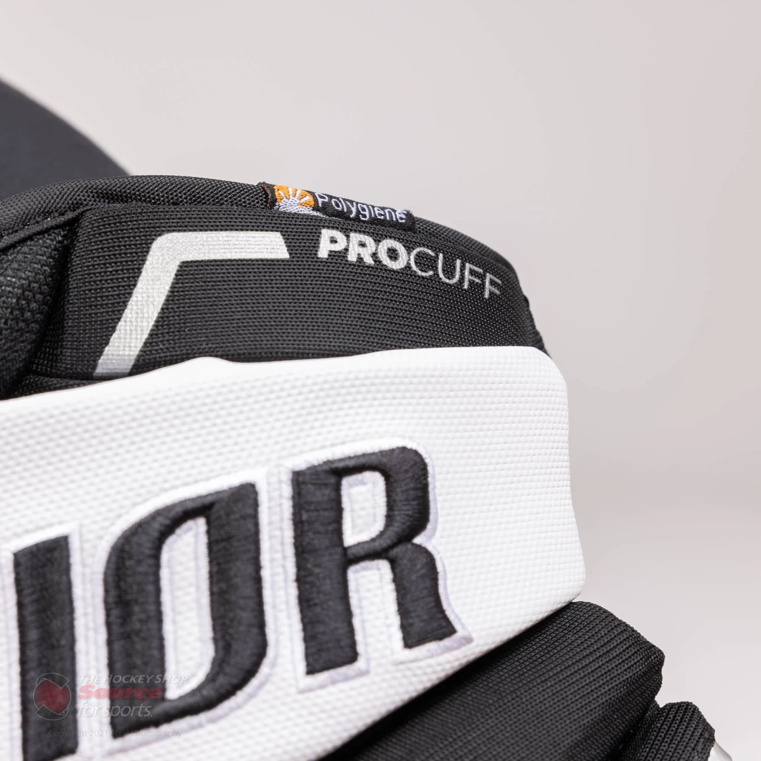 The Hybrid Taper fit allows the anatomical design to contour to the natural shape of your hand, while the Pro Cuff adds an extended range of motion to maximize puck handling and wrist protection.